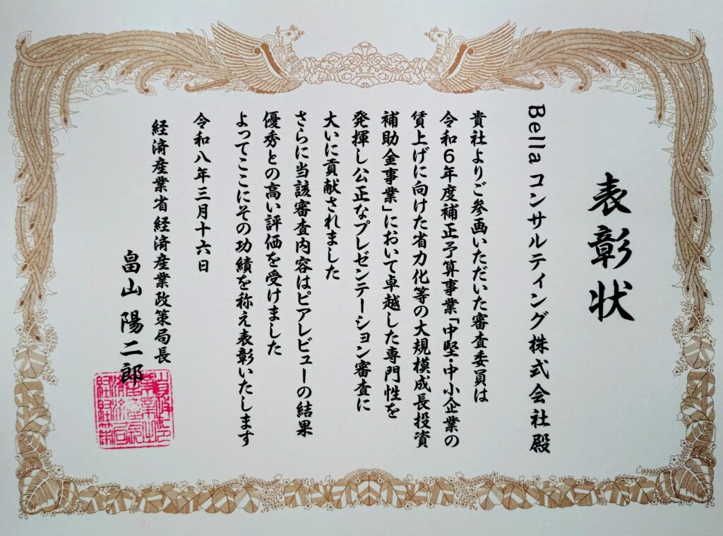 Bellaコンサルティング株式会社は、経済産業省が実施する令和6年度補正予算事業「中堅・中小企業の賃上げに向けた省力化等の大規模成長投資補助金事業」において、審査委員を務めました。
